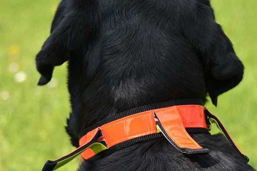 Detta halsband gör det lättare att se om hunden springer mot eller ifrån jägaren. Detta på långa avstånd i skog och mark vid mörker. Halsbandet sätts på med det röda synligt bakifrån och det gula framifrån.