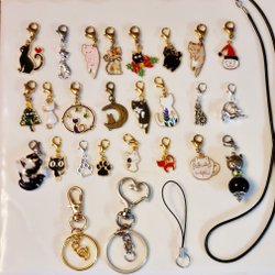 Blandad pärlor i olika färger, former och materialen, även snöflingor och julklockor. Finns 4 par (8 st) jul berlocker. Totalt vikt cirka 150 gr. Storlekar mellan 4mm och 20mm