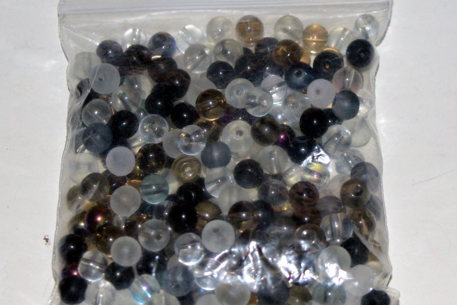 Påse med glaspärlor. Blandade svarta, matta och glasklara.Storlek ca 5 mm.
