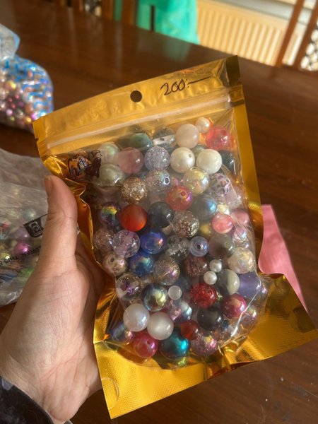 delat upp alla pärlor ifall man ej vill köpa alla. pärlor ca 15-16 mm finns även smått där i som passa penna 200kr vill ja ha då varje pärla kostat 4-5 kr och pysseö är ej billigt