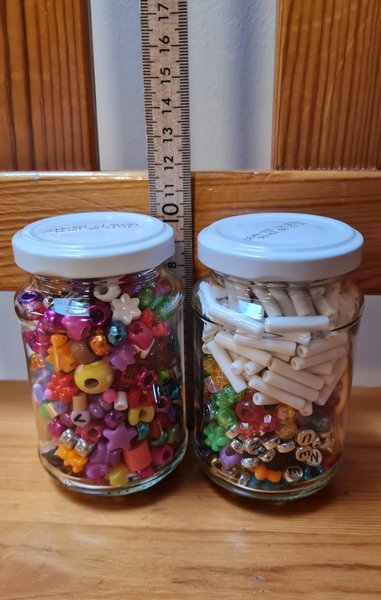 Två glasburkar fyllda med pärlor. En burk innehåller blandade färgglada pärlor i olika former, inklusive stjärnor, hjärtan och runda pärlor. Den andra burken innehåller vita rörpärlor samt en blandning av färgglada pärlor och silverfärgade bokstavspärlor. Burkarna är cirka 10 cm höga. Kan posta utan eller med burkar.