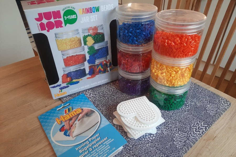 Junior Rainbow Beads Jar Set innehåller 6 färger pärlor i burkar, tillsammans med ironing paper och några pärlplattor.