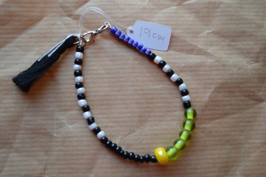 Ett sk. vänskaps armband , 19 cm. Gjort av seedbeads , lime färgade glaspärlor och en stor fokuspärla (gul) mitt på.