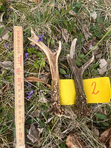 Två hjorthorn i brun/grå färg med ljusa partier. Gul märkning sitter på ena hornet; storleksreferens syns i bilden.