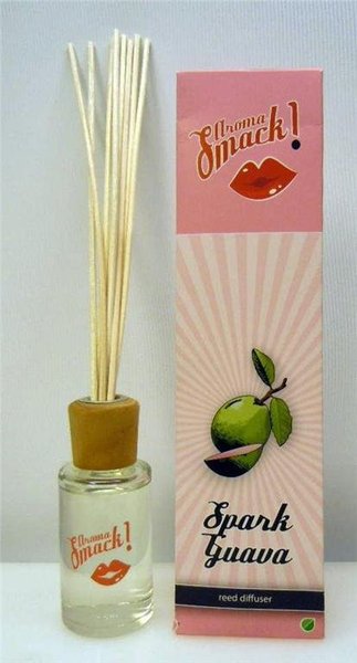Aroma oil, Sark Guava, 100 % Ren olja, 60 ml. Stickorna drar upp parfymen och sprider doft i rummet under två till tre månader. Doftstyrkan kan regleras med antalet stickor. Genom att försiktigt vända stickorna kan Du göra doften starkare.