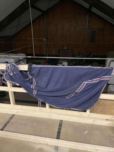 Hästtäcke i marinblått med röda och vita ränder på banden. Täcket har spännen och en mjuk fluff vid manken.