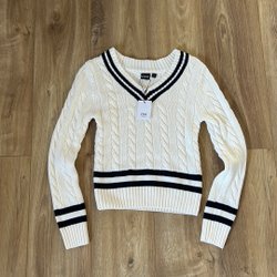 Ett marinblått skrittäcke med ljusblå/vit rutig kant. Svanssnöre. Knäpps med kardborre framför sadeln. Strl 145.