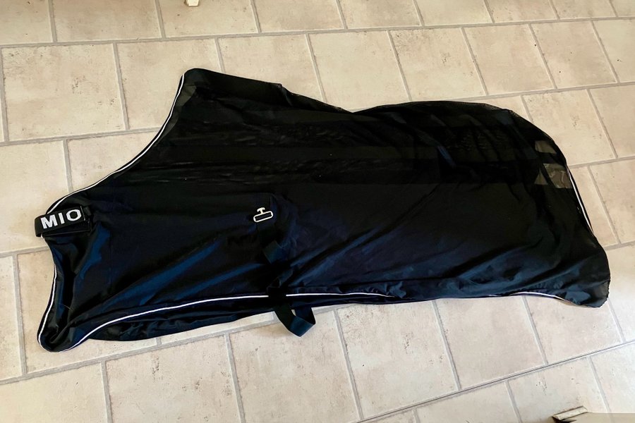 Svart flugtäcke från Mio med vita detaljer. Täcket har ett spänne framtill och en magrem. Stl 6,3=140 knappt använt, mindre hål därav pris.