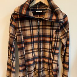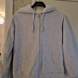 Grå jacka med dragkedja och knappar framtill.