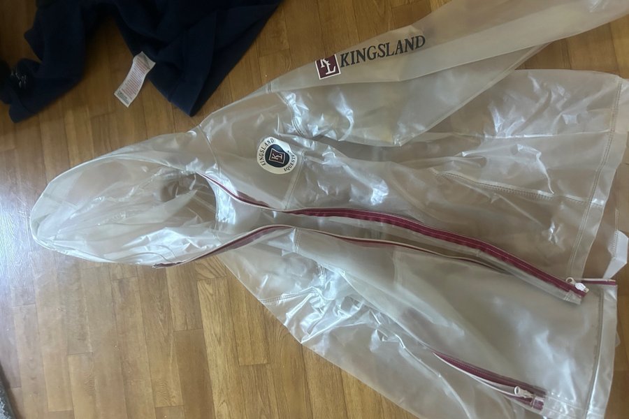 Genomskinlig regnjacka från Kingsland med röd dragkedja. Jackan har en luva och Kingsland logga på bröstet och på ärmen.