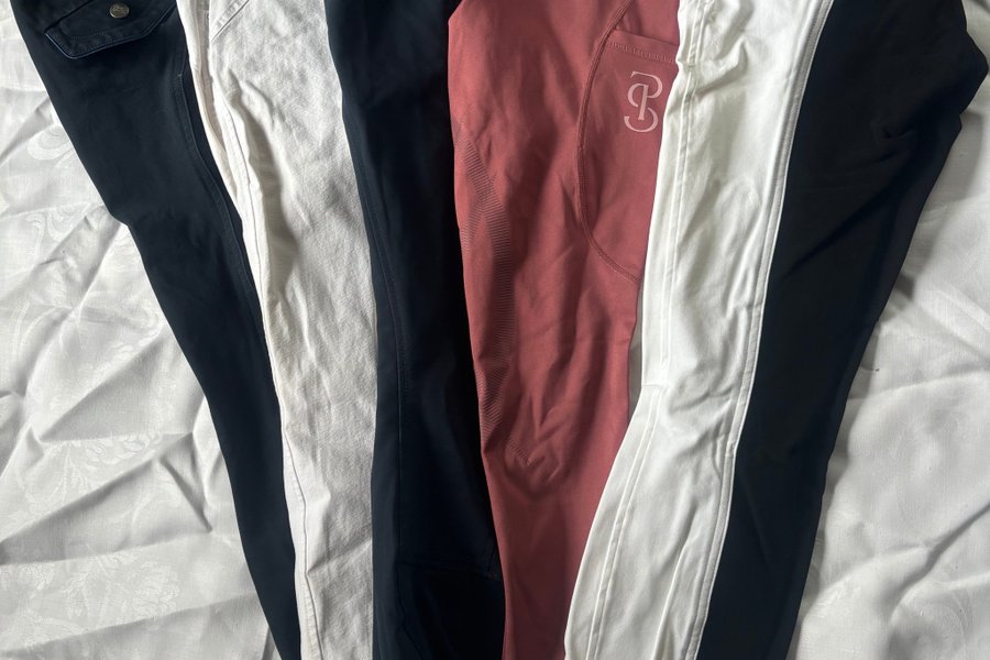 5 st ridbyxor. 2 st siliconskoningar, 3 st med liknande mocka skoningar. Olika skick. Stl 36/38.