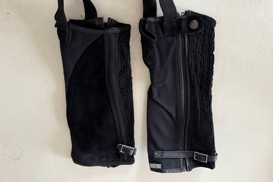 Innehåll: Svarta shortchaps i canvas+mocka (imitation?) med stretchig resår och dragkedja.