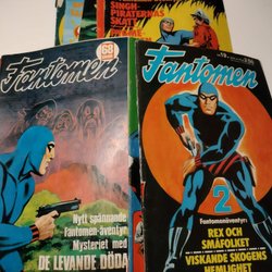 Ett parti med Fantomen tidningar från olika årgångar. Tidningarna har varierande omslag och innehåll.