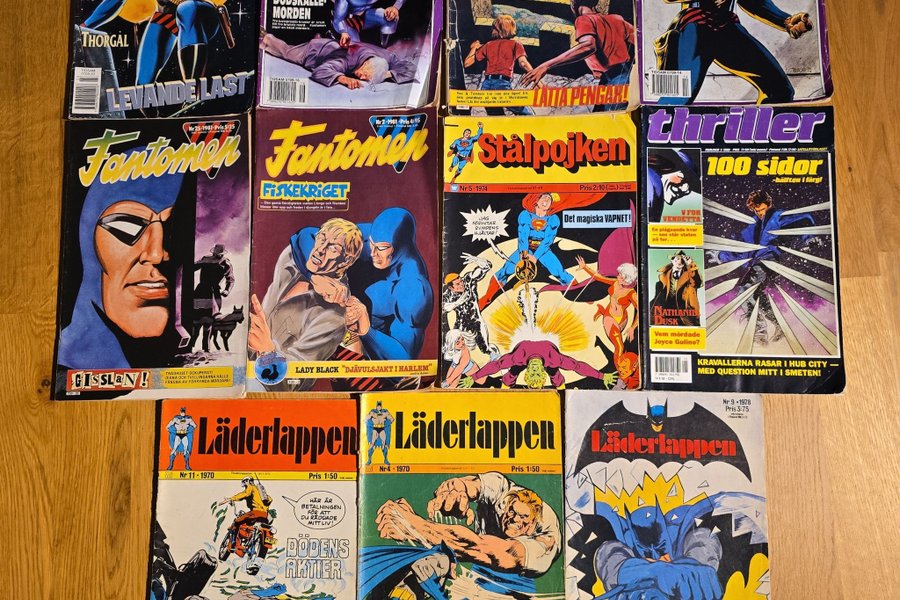 Serietidningar inklusive Fantomen, Stålpojken, Thriller och Läderlappen.