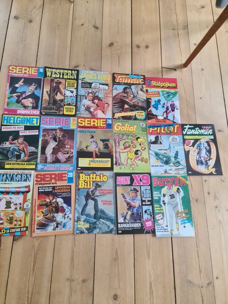 Ett parti med blandade serietidningar. Innehåller titlar som Serie Magasinet, Western, James Bond, Tumac, Stålpojken, Helgonet, Goliat, Pilot, Fantomen, Knasen, Buffalo Bill, Agent X9 och Buster.