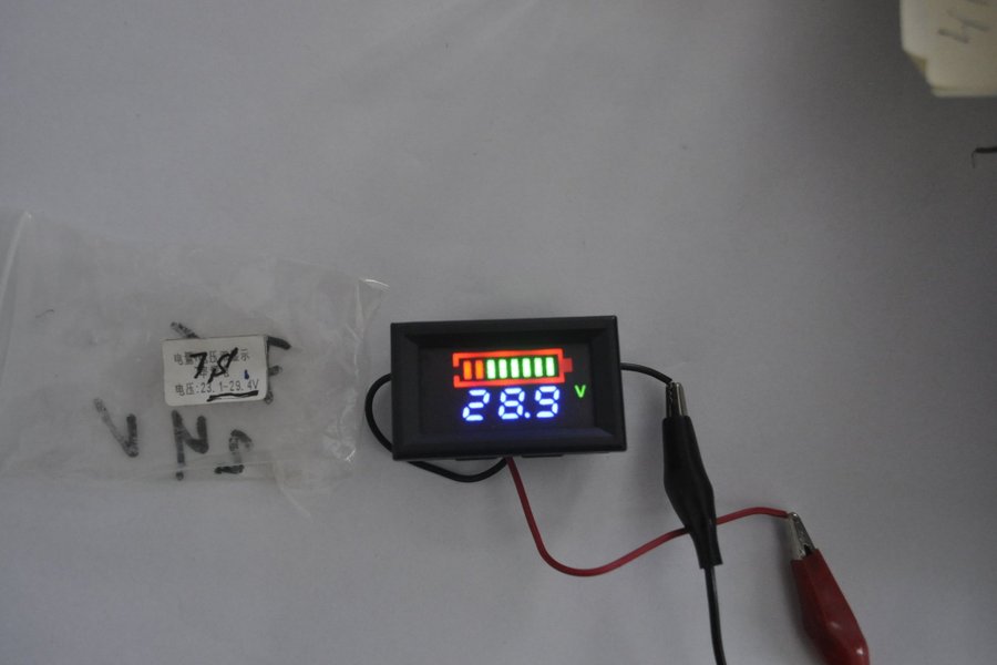 Denna voltmeter visar spänning och har en batteriindikator. Den är utrustad med en tydlig digital display som visar 28.9V. fra ca 3 til 30 volt