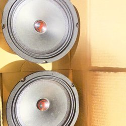 Ett par Bell högtalare. 70-tal. Varje högtalare har 8 element. Anslutningar för 4 ohm parallell och 8 ohm serie.