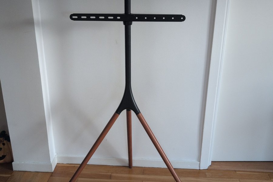 Säljer ett TV-stativ med tre ben. Fästena för TV:n är justerbara.