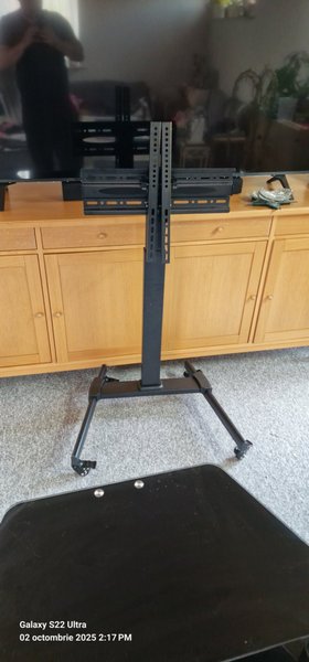 Black TV stand with mounting bracket. The stand has wheels for easy moving. Used on a 70 inch TV, 50kg max, vesa max 480/400, adjustable height and tilt function