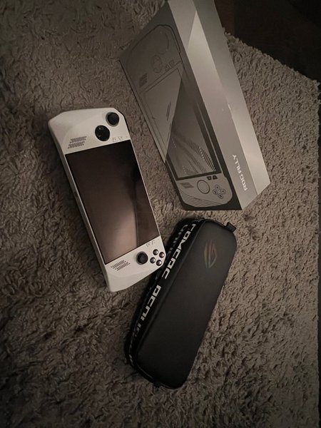 ASUS ROG Ally bärbar gamingkonsol. Konsolen är vit och kommer med en svart förvaringsväska.