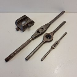 Svängjärn för tappar,svängjärn för gängsnitt, några tappar och gängsnitt.