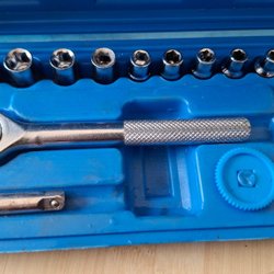 Bitsats med olika hylsor för skruvdragare. Inkluderar en bitshållare. Levereras i en förvaringslåda.