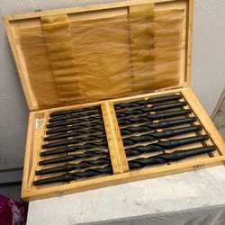 Borrset med olika typer av borrar. Inkluderar träborrar och metallborrar i varierande storlekar. Förvaringsfodral ingår.