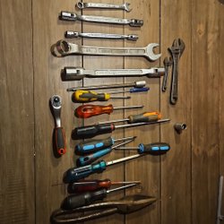 Ett sortiment av olika verktyg, inklusive tänger, skiftnyckel, stansar, handskar och andra diverse verktyg. Perfekt för både hemmafixare och professionella.