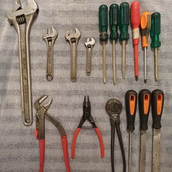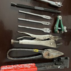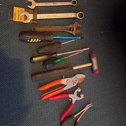 Ett set med verktyg. Inkluderar en popnageltång, en liten tång och en skiftnyckel.