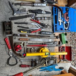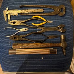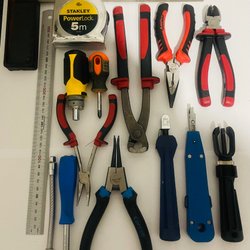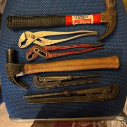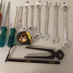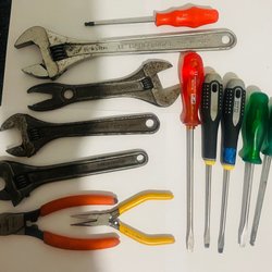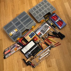 Diverse verktyg, inklusive skruvmejslar i olika storlekar och utföranden, en kniv, en tumstock och en skiftnyckel.