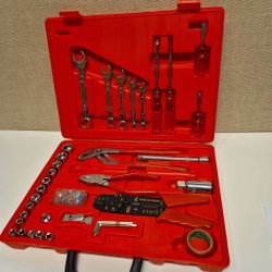Verktygslåda innehållande diverse verktyg som tång, skiftnyckel, skruvmejsel med bits.