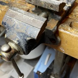Stolpskruvstycke (kallas ibland även smidesskruvstycke, stolpskruvstäd eller bara skruvstäd) Backbredd cirka 11 cm och största gap cirka 17 cm.