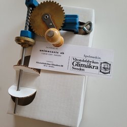 Häftpistol med rött handtag och svart stomme. Modellen är WT-23 och har patentnummer 28480. Ca 15,5 cm bred.