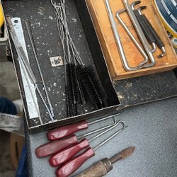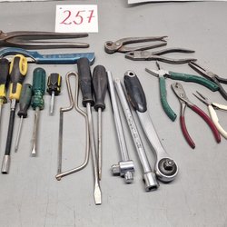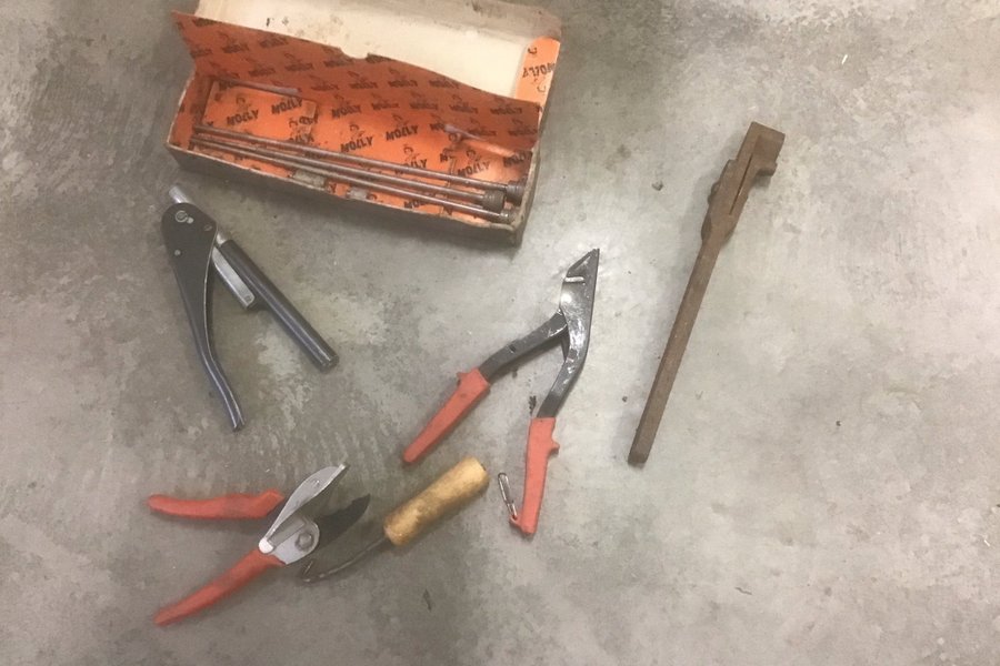 Diverse verktyg säljes. Inkluderar bland annat en låda med Molly-sträckare , bandjärnsspännare , samt gertång .