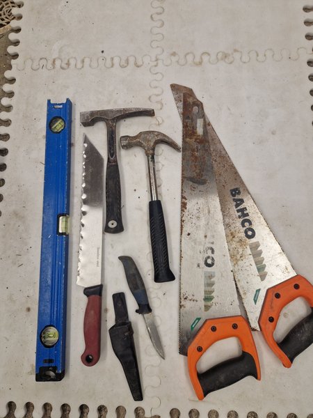 Diverse verktyg såsom vattenpass, hammare, sågar och knivar.