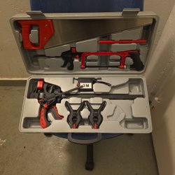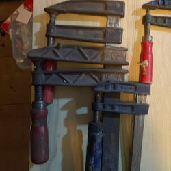 Två tvingar i blått och turkost. Perfekta för att säkra arbetsstycken vid snickeri, limning eller andra projekt. De har en robust konstruktion och är enkla att hantera.