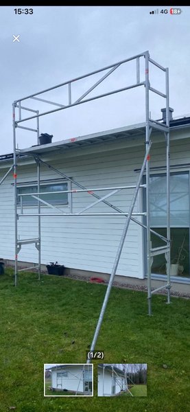 Byggnadsställning för arbete på höjd. Ställningen är monterad och redo att användas.