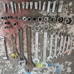 Ett paket med olika verktyg. Innehåller bland annat tänger, skiftnycklar, plåtsaxar, polygriper, rörtänger, avbitare, kabelskalare, en rörtång från Ridgid, en Bahco brännare, en ETC Tools skiftnyckel och en vinkelhake från Hultafors.