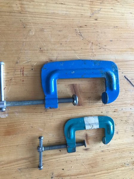 Två tvingar i blått och turkost. Perfekta för att säkra arbetsstycken vid snickeri, limning eller andra projekt. De har en robust konstruktion och är enkla att hantera.