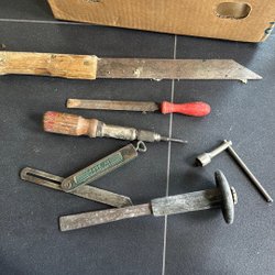 Verktygssats med hammare, skiftnyckel, rörtång, bågfil, kofot och huggmejsel.