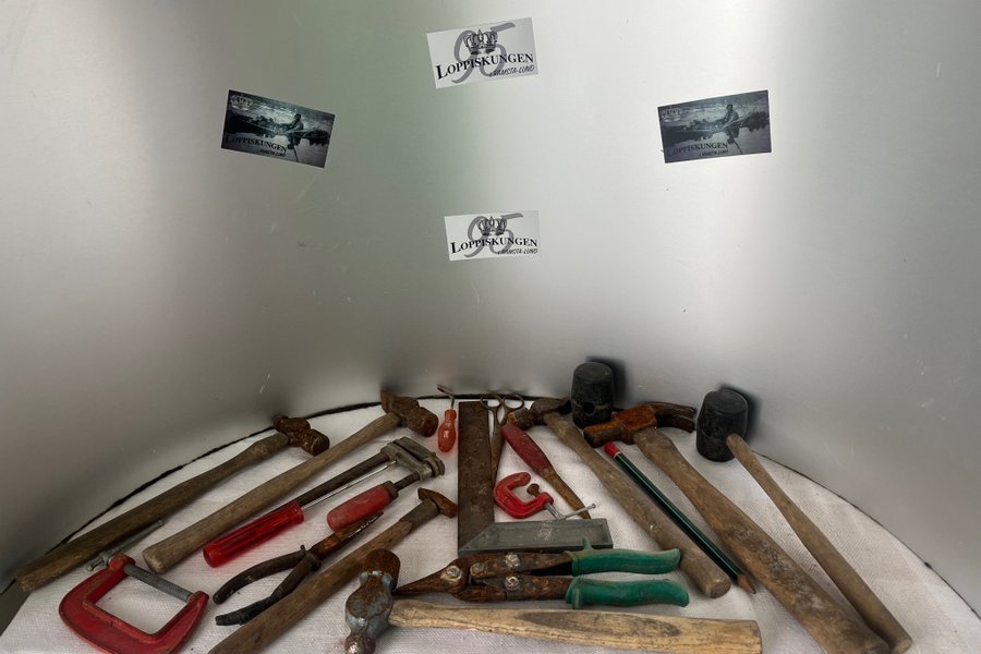 En samling av olika verktyg, inklusive hammare, tänger, skruvmejslar, en tving och en vinkelhake. Verktygen har trähandtag och metallkomponenter.