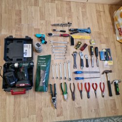 Innehåller ett brett utbud av verktyg för olika ändamål. Paketet inkluderar skiftnycklar, tänger, hammare, skruvmejslar, borrar, en nitpistol, en häftpistol, penslar, färgroller, en domkraft, samt diverse smådelar och förvaringslådor.