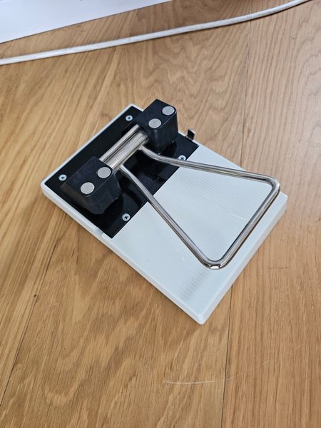 Hålslagare i svart och vit färg. Den har en metallhandtag och metallstansar. Finns i skåne utanför ängelholm