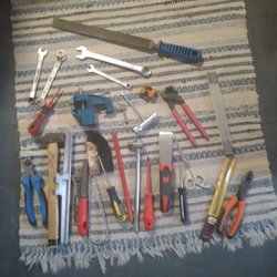 Denna verktygssats innehåller en hammare, skruvmejslar, tänger och andra handverktyg. Perfekt för diverse hushållsreparationer och projekt. Hammare lite sönder