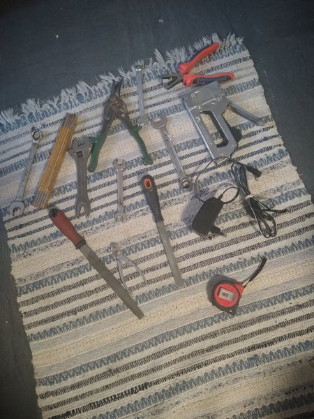 Detta verktygspaket innehåller en blandning av handverktyg. I paketet finns skiftnycklar, en tumstock, en tång, en häftpistol, en fil, en avbitartång, en strömadapter och ett måttband.