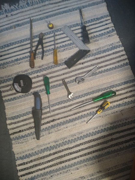 blandade verktyg. Innehåller skruvmejslar, tänger, måttband, vinkelhake, kniv och skiftnycklar.