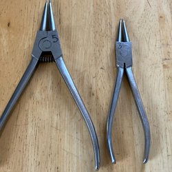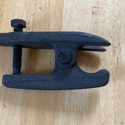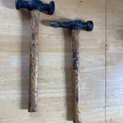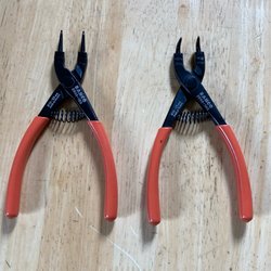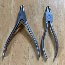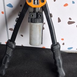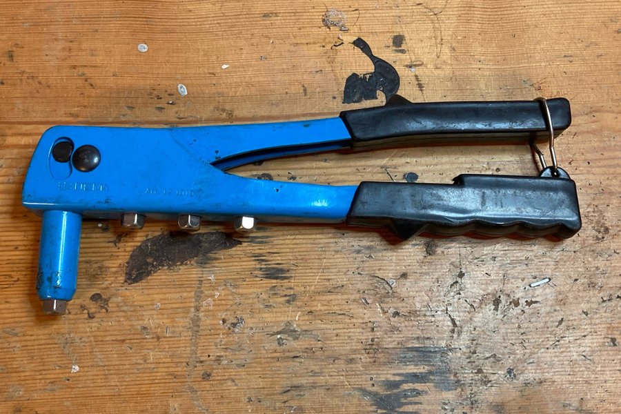 Nitverktyg i blått och svart. Verktyget har svarta handtag och en metallögla för upphängning. Det finns fyra munstycken för olika nitstorlekar.