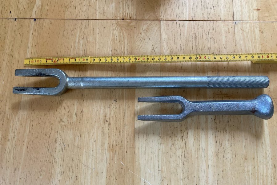 Kulledsavdragare i metall. Den längre avdragaren är 40 cm lång och den kortare är 20 cm lång.