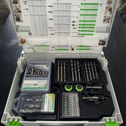 Svart Bosch-låda med borr och bits. Innehåller olika typer av borr, inklusive metallborr och träborr. Bitsen inkluderar spår, Phillips, Pozidriv, Torx och insex. Även hylsbits och försänkare ingår.