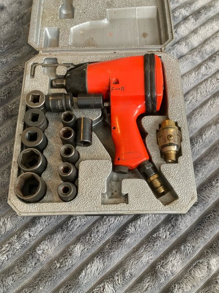 Luftdriven mutterdragare i rött och svart, förvarad i en grå verktygslåda. Setet inkluderar olika hylsor i varierande storlekar samt en insexnyckel och en luftkoppling.